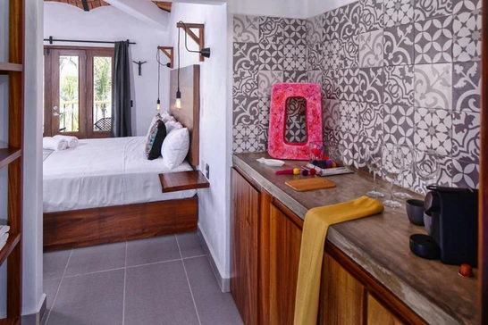 This huge suite is filled with designer furniture, a large Art decó kitchenette and original Mexican artwork. The suite is located right at the end of the hotel main terrace. You will be able to enjoy, through its large window, an amazing view of the ocean, the jungle, and the town.